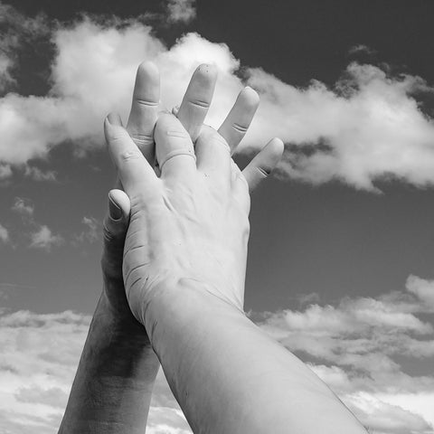 A digital image showing part of Lorenzo Quinn's monumental sculpture in Venice.Six pairs of hands stretch across a canal in different gestures showing unity, love and empathy. A strong and striking artwork in black and white.