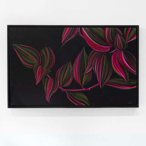 This piece is a close-up cropped view of a Tradescantia Nanouk houseplant, often referred to as the Wandering Dude. The bold, rich layers of magenta and green are exaggerated to enhance the striking contrast of this plant, with two opposing colours emerging together on each individual leaf. The multiple glazes create the almost iridescent quality of the plant, and lifts each undulating element away from the deep blue-black background.