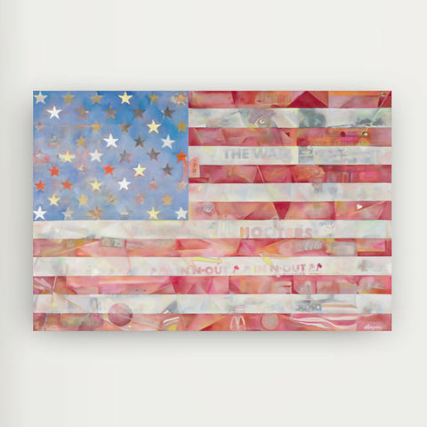 Americana reimagines the American flag through layers of contemporary culture—constructed from current magazines, newspapers, comic strips, and even a paper burger hat. Each element is carefully chosen to reflect the noise, humor, and culture of the present-day United States.